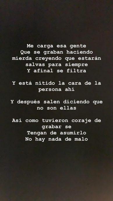 A esto ahora se suma la publicación que hizo recientemente Michelle Carvalho, quien arremete contra el argentino. “Me carga esa gente que se graban haciendo mierda creyendo que estarán salvas para siempre y al final se filtra. Y está nítida la cara de la persona ahí y después salen diciendo que no son ellas. Así como tuvieron el coraje de grabarse tengan que asumirlo, no hay nada de malo”, escribió.